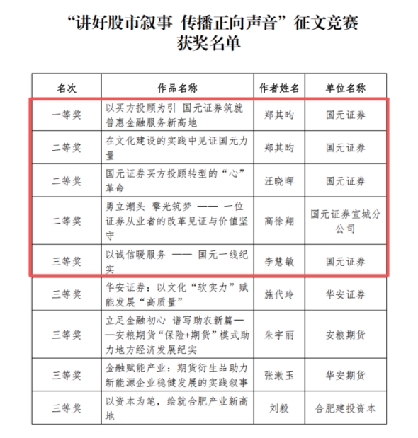 近日,由安徽证监局指导,安徽省证券期货业协会主办的“讲好股市叙事 传播正向声音”征文竞赛落下帷幕。国元证券凭借深厚的行业积淀与优质创作,在此次竞赛中表现亮眼,斩获多个奖项,其中一等奖1篇、二等奖3篇、三等奖1篇。